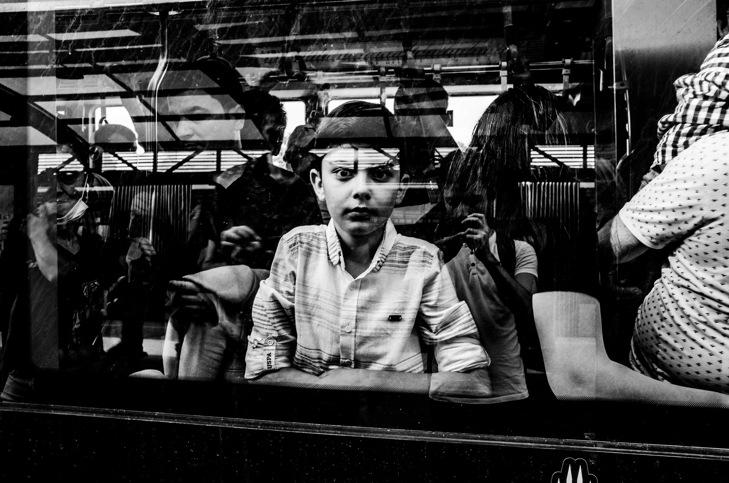 A boy with a striped shirt looking directly at the camera through a glass window, with reflections of people behind him in a busy indoor location.