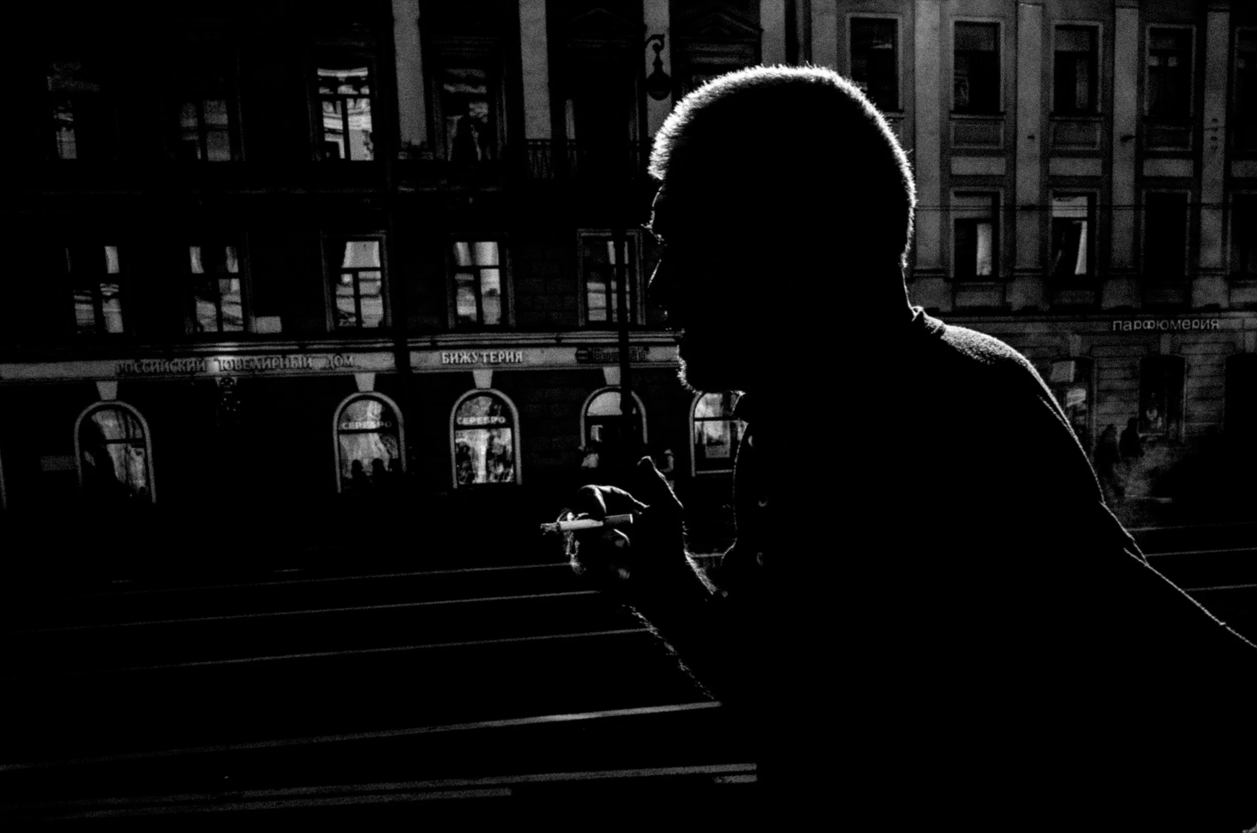 Silhouette of a man smoking a cigarette in an urban area during the daytime, with buildings and signs in the background.
